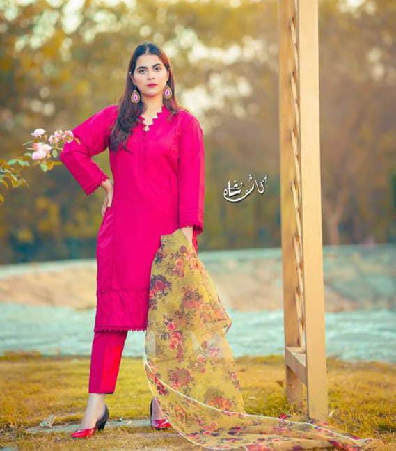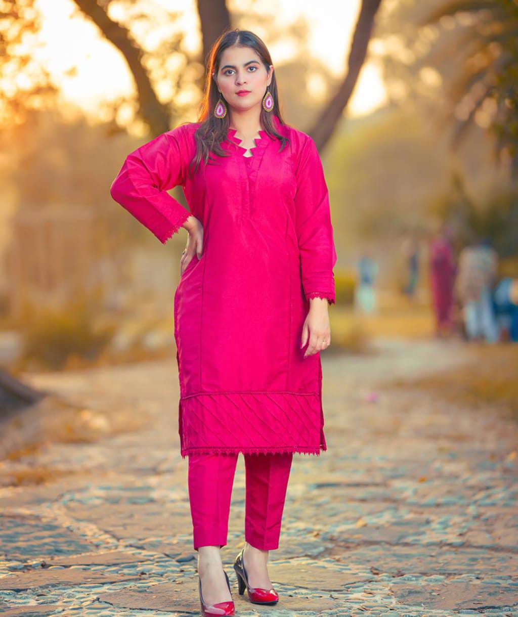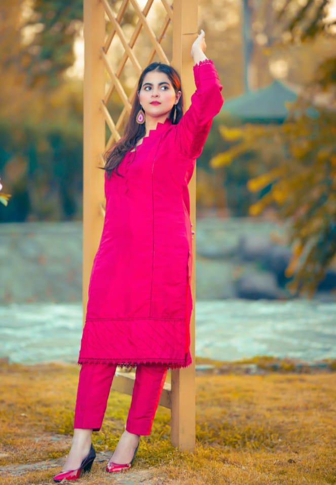 Make a statement with this vibrant fuchsia pink ensemble that beautifully blends elegance and simplicity. The straight-cut kurta features delicate detailing on the neckline and sleeves, paired with a matching trouser for a sleek silhouette. The outfit is complemented by a soft, floral chiffon dupatta in warm earthy tones, adding a touch of femininity and charm to your look. Fabric Details:
